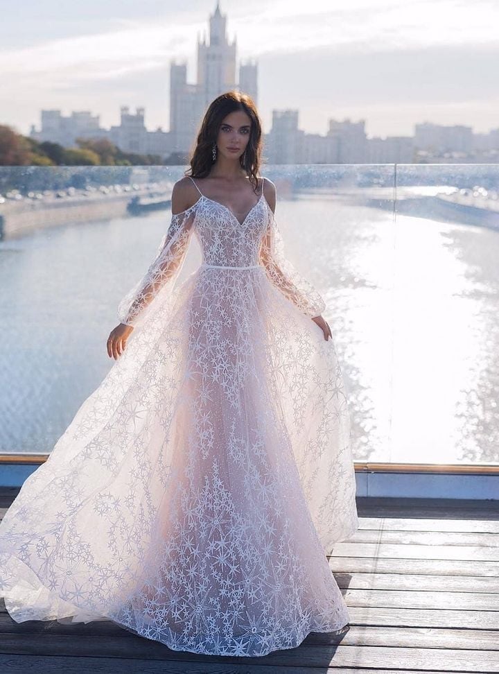 Transparan dokular bu yılın en dikkat çeken detaylarından. Özellikle omuz, kol ve sırt bölgelerinde kullanılan tül ve dantel kombinasyonları; zarif, romantik ve biraz da cesur bir görünüm sunuyor. İllüzyon yaka ve sırt detayları, hem klasik hem modern gelinler için harika bir seçenek.